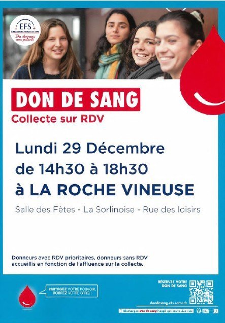 La prochaine collecte de sang du Val Lamartinien aura lieu le Lundi 29 décembre 2025 à la Roche Vineuse de 14h30 à 18h30 - salle des fêtes La Sorlinoise - Rue des Loisirs.