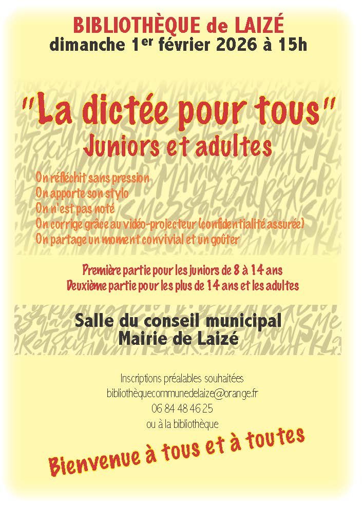 La bibliothèque de Laizé vous propose "La dictée pour tous", un rendez-vous ouvert à tous, sans compétition ni notation.