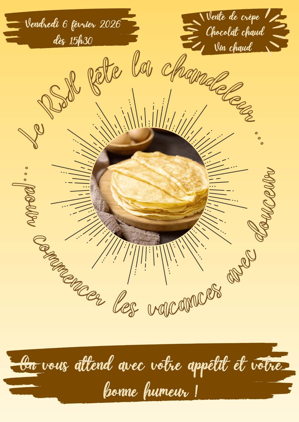 Vente de crêpes, chocolat et vin chaud dès 15 h 30 au restaurant scolaire le vendredi 6 février